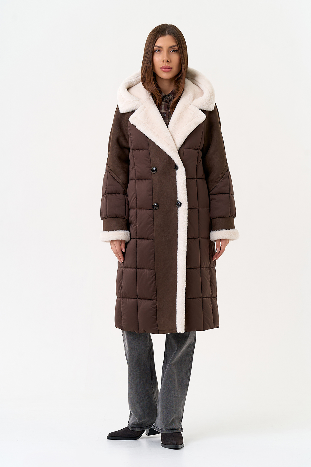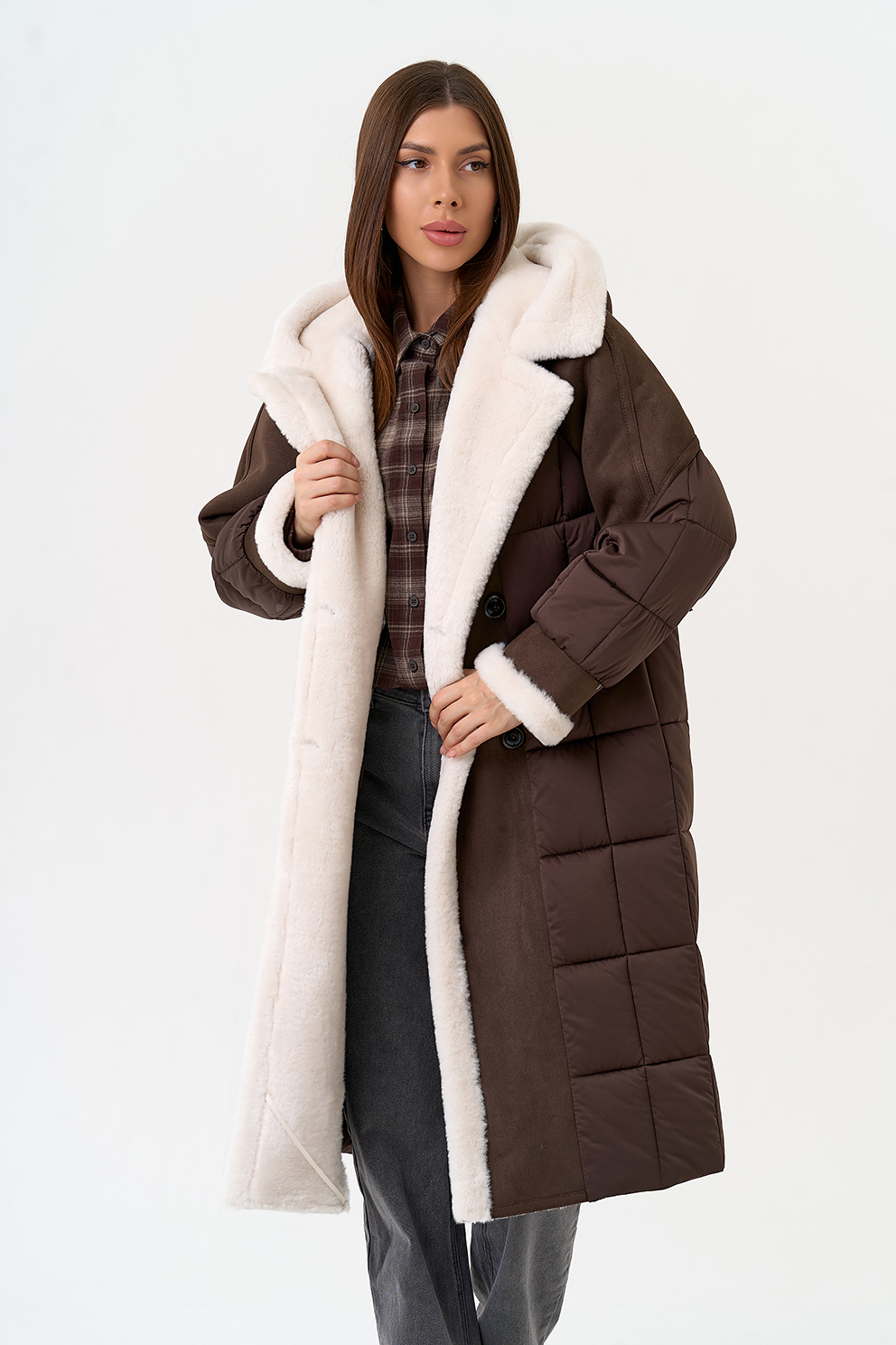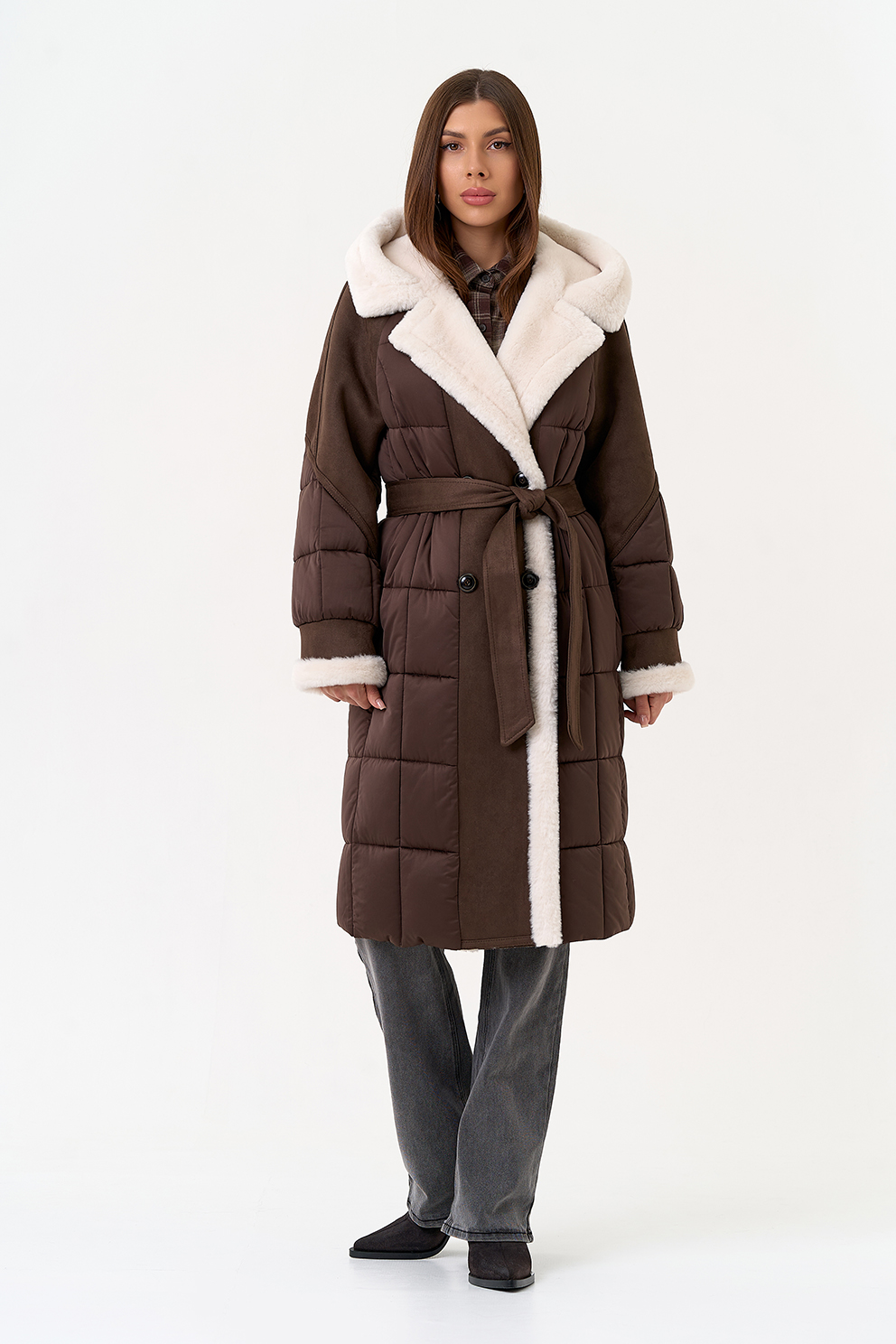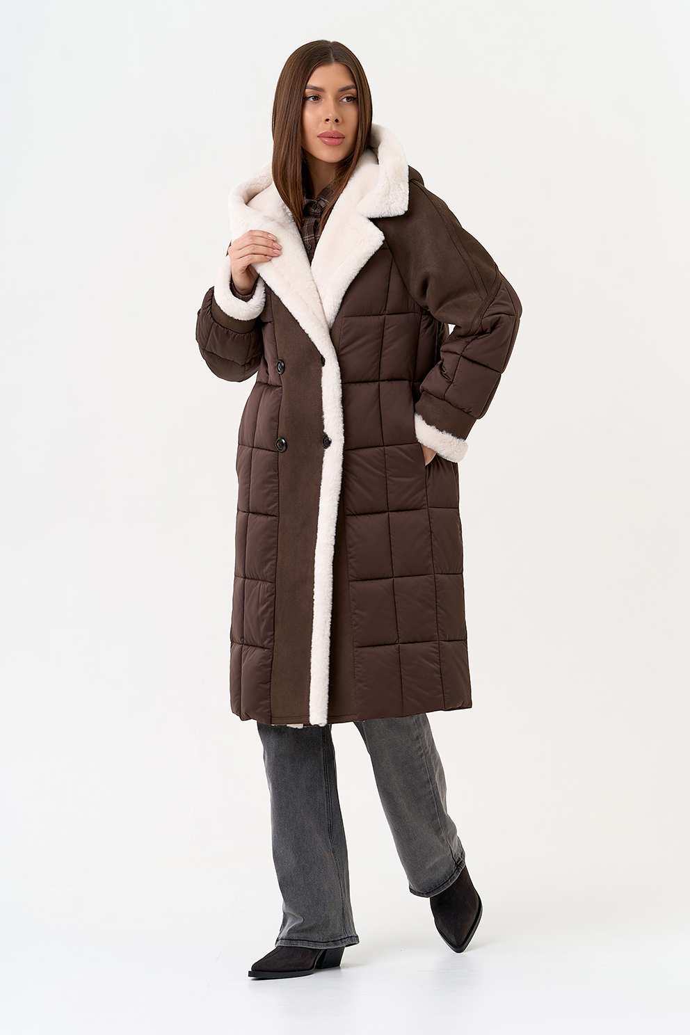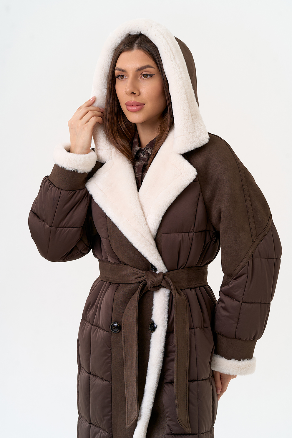 Крой воротника - капюшон, отделка эко мех